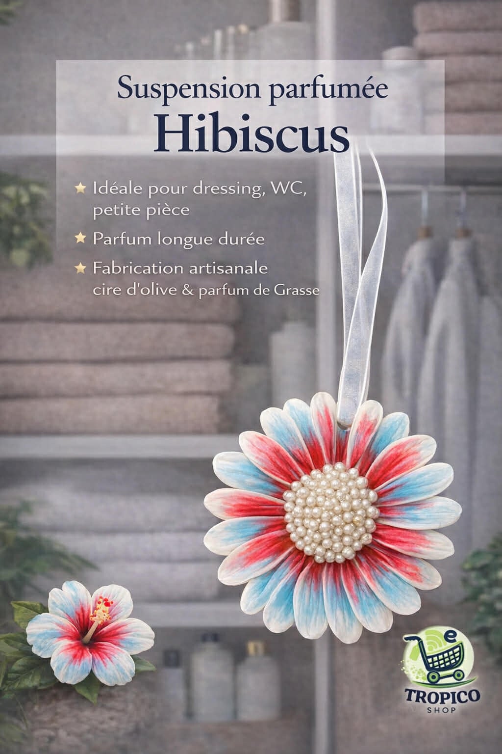 Une suspension de cire 100% végétale d'olive au *parfum de Grasse HIBISCUS avec son ruban à accrocher dans vos espaces clos (armoire, dressing, salle de bain, toilette etc ..).